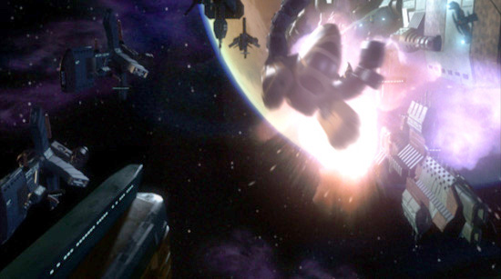 This image is from the opening sequence in Colony Wars:Red Sun. It's not very clear but it was difficult to find a frame that did justice to the finished shot. You can see the animated version in the showreel section. The spaceships are based on designs supplied by the wonderful people at Psygnosis and modelled by some of my colleagues at Havoc.