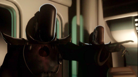 Another unspectacular image from Colony Wars:Red Sun. Again you can see the animated version in the showreel section. The characters are based on designs supplied by Psygnosis and modelled by John Lomax at Havoc. I was quite excited by this scene because it was my first attempt at character animation. The finer nuances of the performance don't really work in this still though.