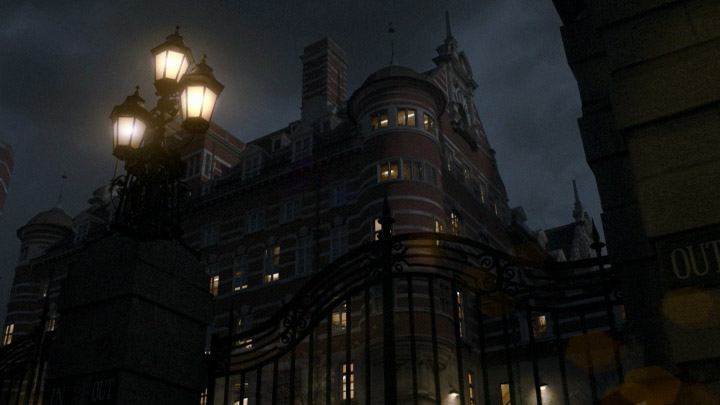 Hold the mouse over the image to see the original photo. Jericho (ITV, 2005): Scotland Yard, 1957. I made this shot from a photo I shot myself with a digital SLR. I completed the shot in Digital Fusion, adding moving clouds, animating lights, film grain & weave etc. Originally I had the inside windows illumated with colder strip lighting, but the greenish tint made the shot look more like an asylum.